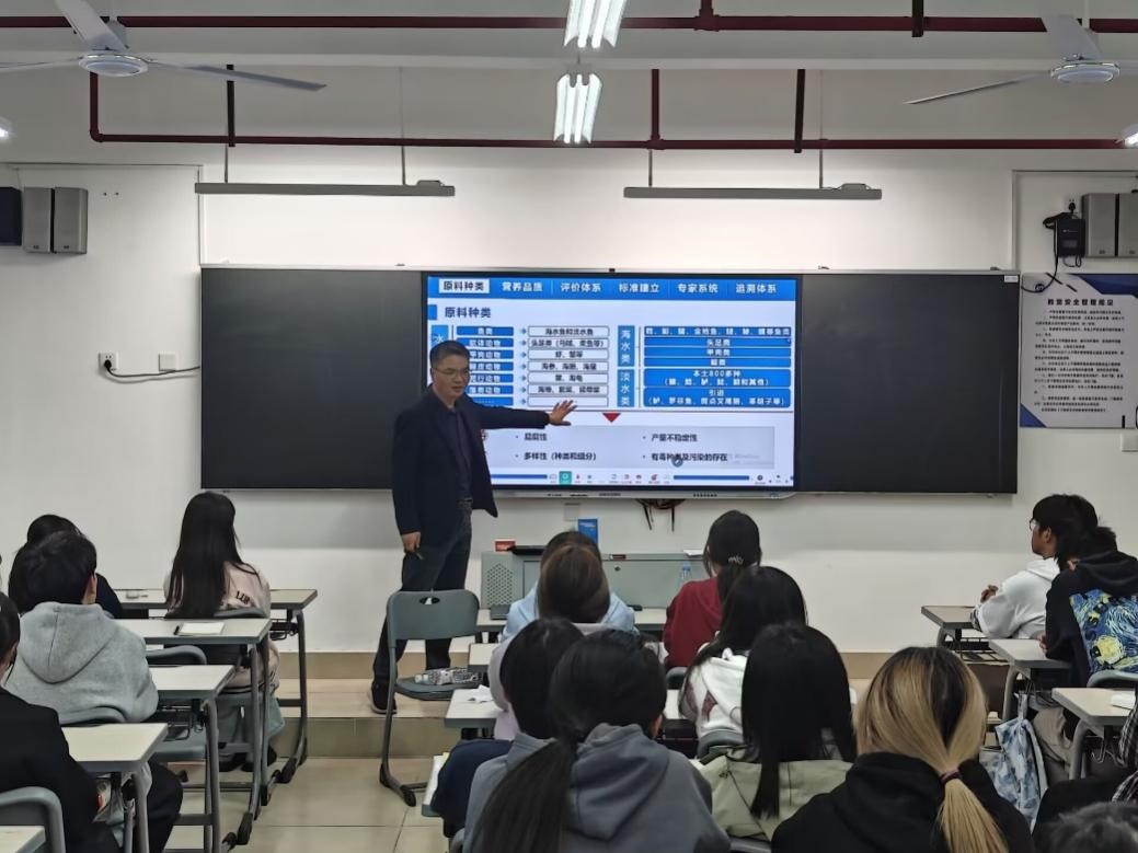 讲座伊始,郭全友就食品科学与工程和海洋资源开发技术这两个专业的大学未来规划和发展方向提供了建议,让学生们对自己的专业、大学生活以及就业方向有了更深层次的认识。接着,郭全友以海产品为出发点,从原料种类和营养品质入手,通过大黄鱼鱼丸、金枪鱼生鱼片等例子生动的把海产品的高价值进行详细阐述。讲座中,郭全友引入了成体系化这一概念,解释了全效利用的意义,并将人们日常生活中常见、常吃的水产品结合具体加工事例从原料种类、营养品质、评价体系、标准建立、专家系统等方面详细剖析,对水产品加工行业中的主要问题、产品形式、技术体系、共性技术和产业链条进行用心解说,让同学们更好将理论知识与实际生产联系起来,增加认识。
