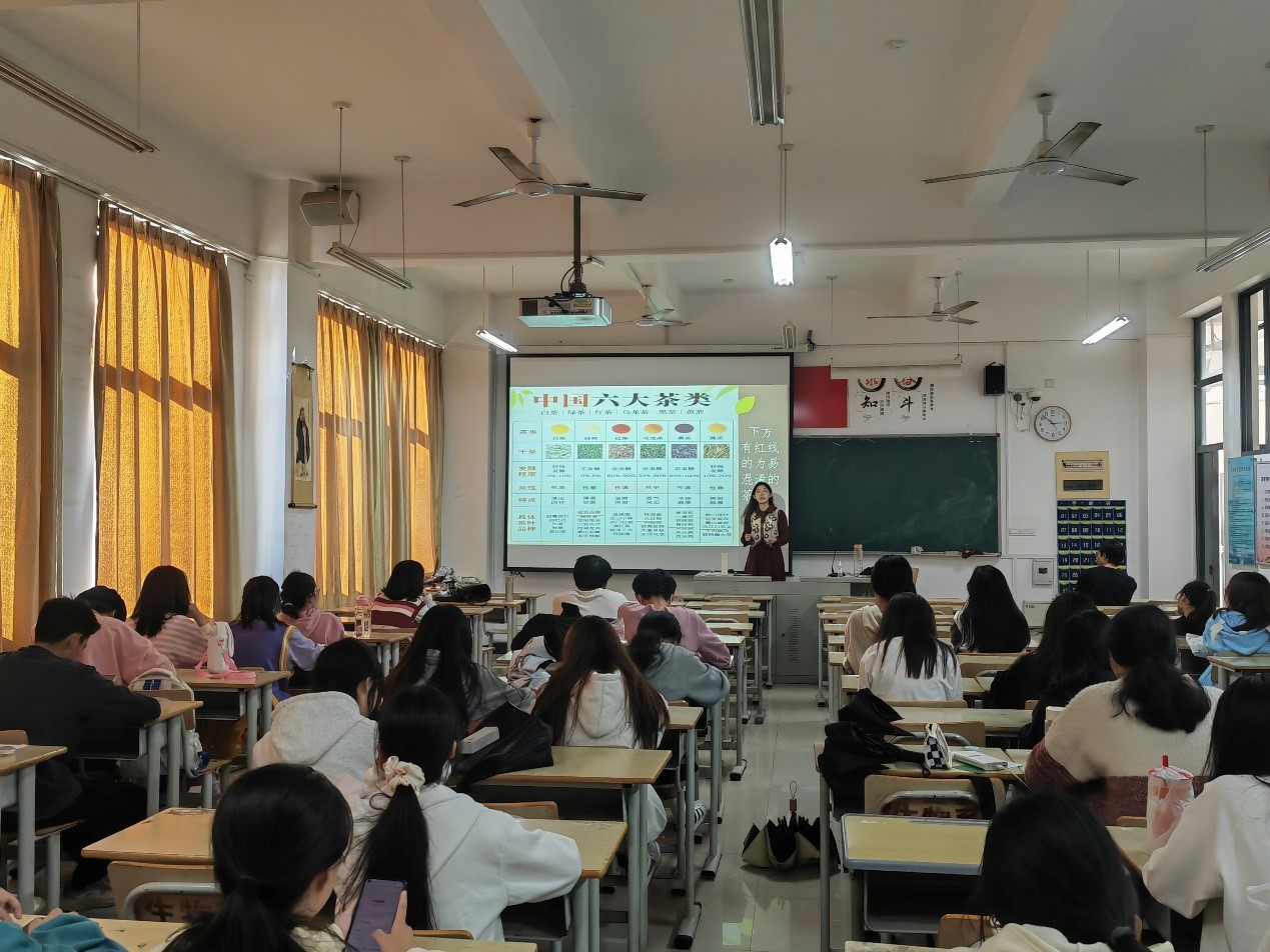 本次美育培训中,茶协会的王宁宁同学通过茶的由来、茶的种类、茶的工艺过程以及茶的功效四个方面给同学们介绍六大茶类的相关知识。 “茶者,南方之嘉木也”,王宁宁同学首先通过引用《茶经——之源》中的一句话展开对茶的由来的论述。其次,王宁宁同学根据制作方法和茶多酚氧化(发酵)程度不同,谈到六大茶类:绿茶(不发酵),白茶(轻微发酵),黄茶(轻发酵),青茶(半发酵),黑茶(后发酵),红茶(全发酵)。接着,王宁宁同学向大家展示六大茶的加工流程并且进行了详细的讲解,让同学们更加充分地了解到茶的工艺过程。最后,王宁宁同学详细地讲述了六大茶类的功效,如黑茶具有降压,降脂,抗菌,减肥等作用,提高了同学们对茶的兴趣。