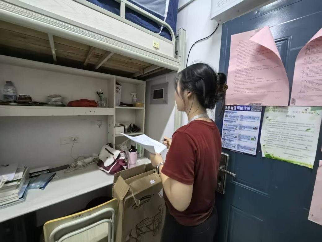 检查初期,实践部负责人对此次检查重点做了说明,一是卫生环境检查,对宿舍内务整理、物品摆放、环境卫生等方面进行评估,针对部分宿舍存在的杂物堆积、卫生死角等问题现场提出整改建议;二是安全隐患排查,仔细查看宿舍内是否违规使用大功率电器、私拉乱接电线等情况,提醒新生增强用电安全意识,从源头杜绝安全风险。同时也着重强调了敲门以及如何与新生沟通的问题。在检查过程中,实践部成员对宿舍信息登记表没有贴到门上,以及部分寝室的排插上床等问题做了提醒和重点关注,同时,告知了相对应的辅导员。对于一些无法当面解决,需要专业人员维修的问题,实践部也做了相对应的报修和记录工作。