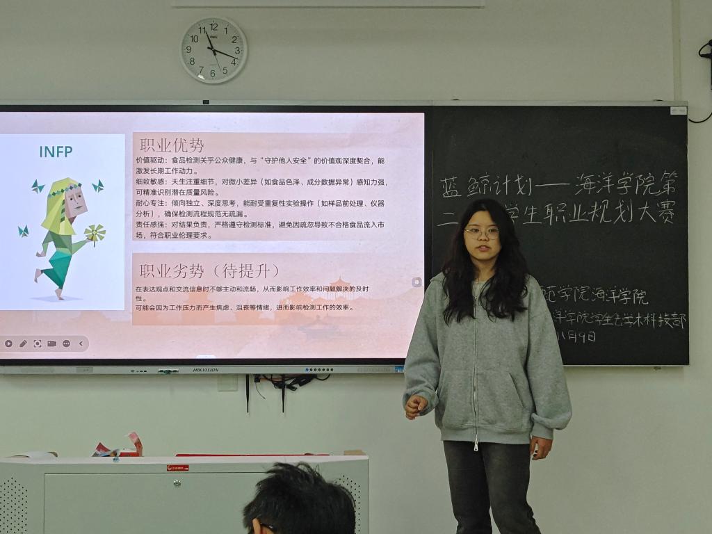 大赛现场,参赛选手紧扣“探索蓝色梦想,规划未来航程”主题,立足个人兴趣与专业特长,结合食品与海洋领域发展需求,进行了系统而全面的职业规划展示。选手们从自我认知、环境分析、职业目标定位、实施路径设计到动态评估调整,多维度阐述了个人职业愿景与发展路径。清晰的逻辑结构、饱满的展示热情以及对未来职业的深入思考,充分展现了pp电子官方网站学子扎实的专业功底与积极向上的精神风貌。