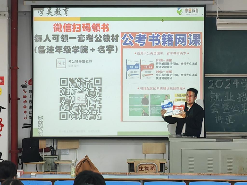 宣讲会伊始,主讲人雷老师先向同学们整体介绍了学昊教育的组成体系,让同学们对学昊教育有了一定的了解。而后对公职类岗位进行全面的分析,剖析了国考、省考、选调、国企与事业单位等考试。接着再延伸至各岗位工作的薪资待遇与发展前景,其中,公务员的工资由基本工资、津贴、补贴和奖金组成,五险一金基数与比例高,而公积金则是体制的隐藏优势。最后为同学们详细介绍了备考方法,从备考时间到备考内容都包括在内。
