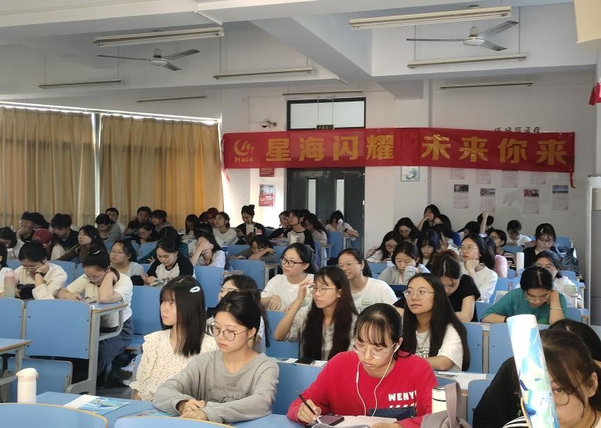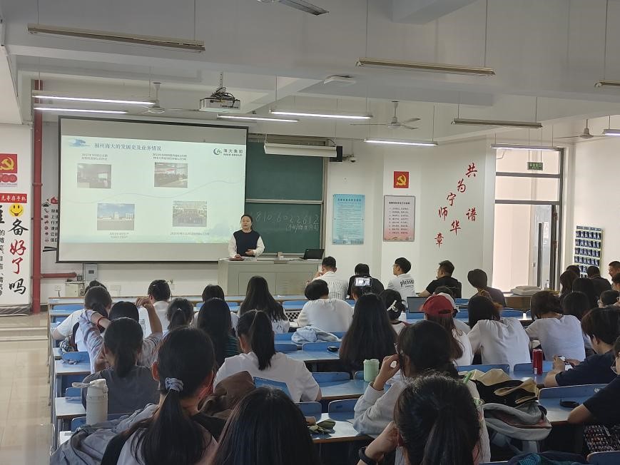 此次宣讲会首先由海大集团招聘人员向现场同学们放映海大集团宣传片,据了解,海大集团已成长为一家涵盖饲料、种苗、动保疫苗、智慧养殖、食品加工等现代农牧全产业链的高新农牧企业。随后,招聘人员向每位同学分发了海大集团的宣传册,并且以ppt的形式主要给同学们介绍了福州海大集团的发展史和业务情况,在宣讲现场同学们认真听讲,招聘人员与同学们进行交流互动,现场氛围热烈。