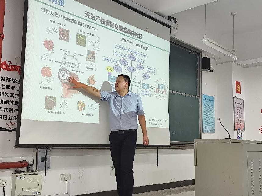 丁骁副研究员首先介绍了溶酶体的结构和功能,强调了溶酶体在细胞内物质代谢和降解过程中的重要作用;他以讲故事的方式分享了他们团队在不同药用植物中发现的几类具有调控溶酶体生成的活性天然产物,并通过分子机制研究揭示了这些活性物质的潜在作用机理。丁骁副研究员还特地介绍了昆明植物研究所的研究生招生考试情况,让同学们能了解相关考试科目和一些报考注意事项。在报告的最后,丁骁副研究员与在场的师生进行了深入的交流和讨论,获得在场师生的阵阵掌声和好评。