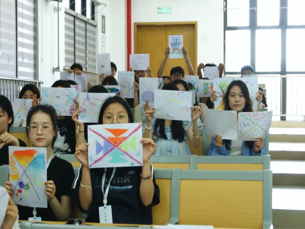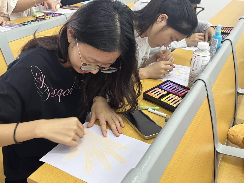 作品完成后,学生们开始互相分享创作故事。食品专业林同学展示了一幅以灯塔为中心的海景画:“海浪代表生活中的挑战,灯塔的光象征家人的支持和自己的内心力量。”海洋专业陈同学则通过破碎又重组的几何图形,讲述自己从迷茫到重拾信心的过程。在分享与倾听中,现场不时爆发出理解的掌声,不少学生表示“没想到一幅画能让同学如此了解自己”。