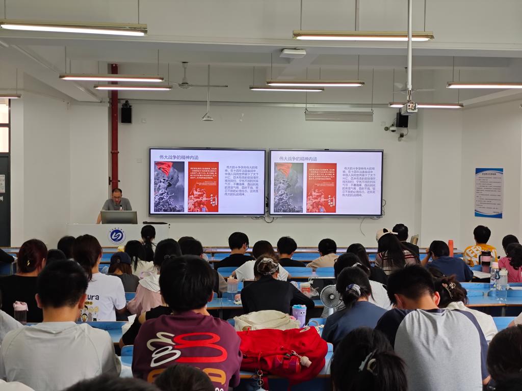 报告上,郭正武围绕爱国热情、楷模事迹、中国共产党中流砥柱作用和伟大抗战精神内核等内容展开。课程伊始,郭正武副院长带领同学们重温了中华民族艰苦卓绝的抗战岁月。通过丰富的历史资料和生动讲述,他深刻揭示了日本侵略者的暴行和中华民族当时面临的空前危机,引导广大青年铭记历史、珍视和平。随后,郭正武讲述了杨靖宇、赵一曼、左权等无数抗日英雄可歌可泣的英勇事迹,以及“狼牙山五壮士”等群体所展现出的视死如归、宁死不屈的民族气节,激励同学们从楷模事迹中汲取精神力量,自觉传承红色基因。在课程核心部分,郭正武重点阐述了中国共产党作为全民族抗战中流砥柱的伟大作用,系统介绍了中国共产党在倡导建立抗日民族统一战线、提出全面抗战路线与持久战战略、开辟敌后战场等方面的重要贡献,并强调了纪律建设在这一历史进程中发挥的关键作用。课程最后,郭正武深入解读了伟大抗战精神的精神内核与时代价值——天下兴亡、匹夫有责的爱国情怀,视死如归、宁死不屈的民族气节,不畏强暴、血战到底的英雄气概,百折不挠、坚忍不拔的必胜信念。他指出,这一跨越时空的精神力量是实现民族复兴的强大动力。在新时代征程中,面对机遇与挑战,我们更应大力弘扬伟大抗战精神,坚定“四个自信”,从中汲取磅礴奋进力量,为全面建设社会主义现代化国家、实现中华民族伟大复兴的中国梦而不懈奋斗。