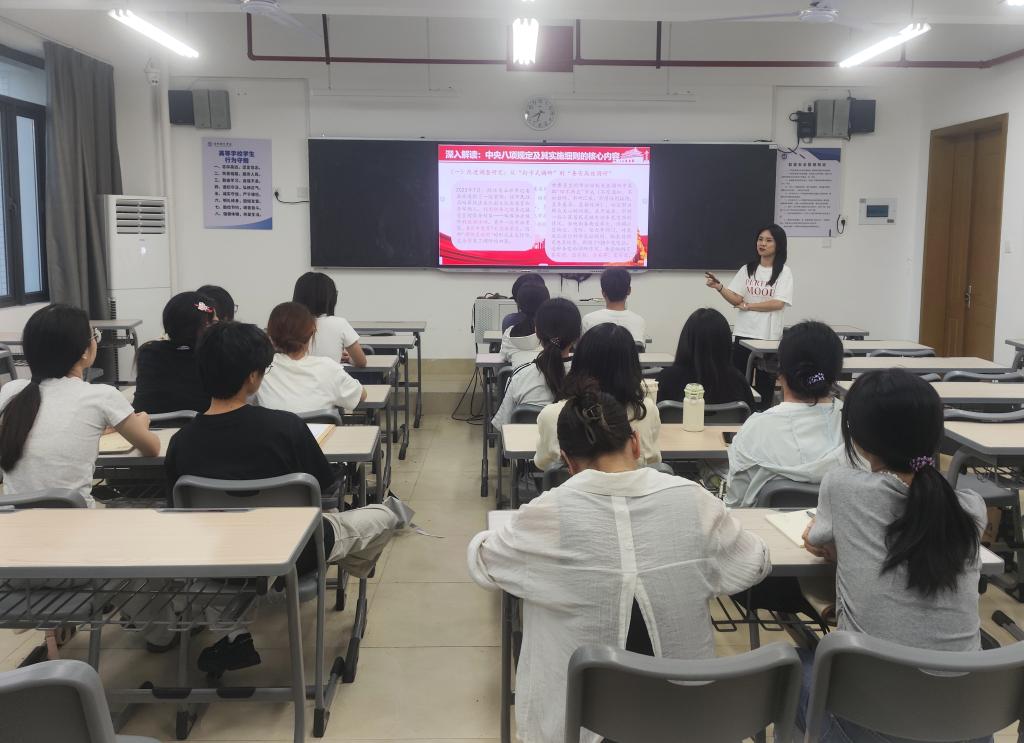 为深入学习贯彻中央八项规定精神,持续深化作风建设,pp电子学生党支部于6月26日在医教楼601开展“学习贯彻中央八项规定精神,争做新时代作风建设排头兵”主题党课。主讲人为学生党支部书记苏晗,支部全体党员共同参与。
