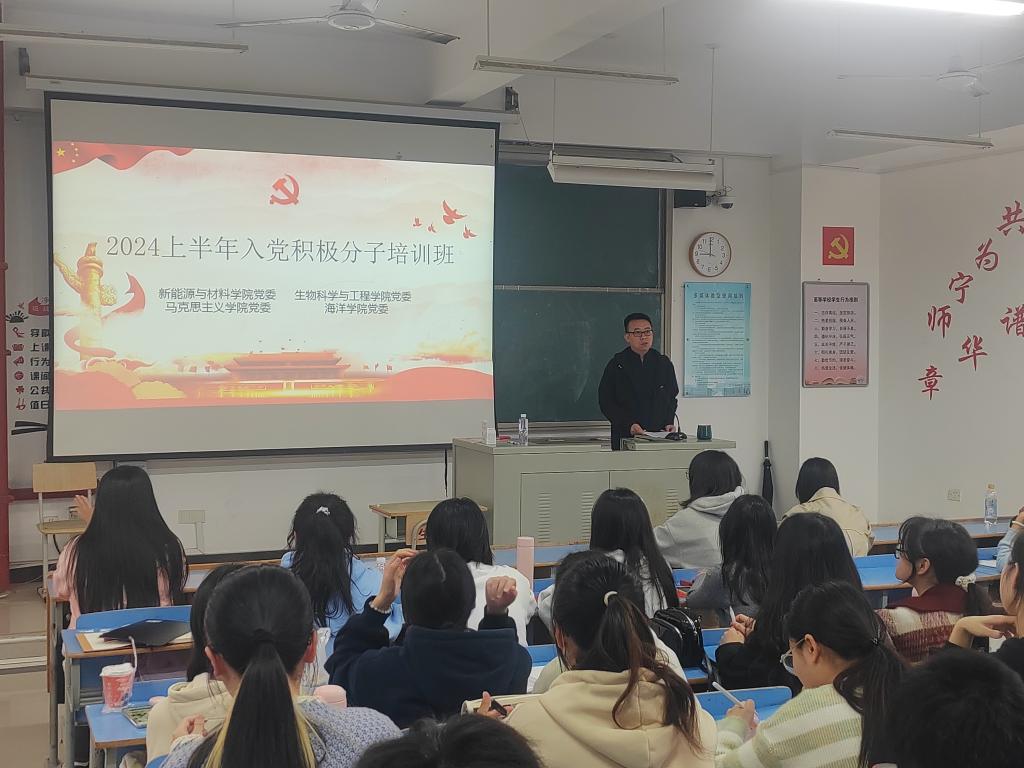 为深入学习贯彻习近平新时代中国特色社会主义思想和二十大精神,切实做好入党积极分子培养教育工作,进一步加强入党积极分子对党的全面认识,指引入党积极分子增强党性认识、提高党性修养,蓄好党员队伍“源头活水”。pp电子官方网站、新能源与材料学院、马克思主义学院、生物科学与工程学院四院于2024年3月23日上午在求实楼C区201开展2024年上半年入党积极分子四院联合培训班的开班以及“学习党章 践行党章”第一次专题辅导报告。